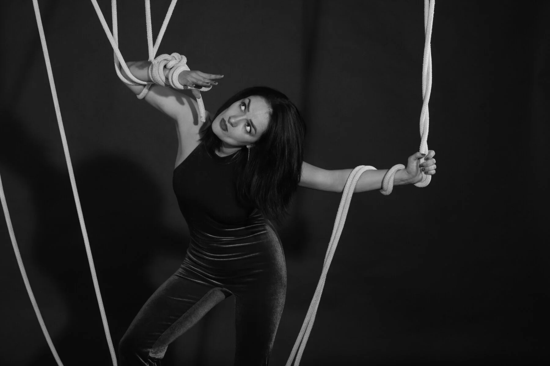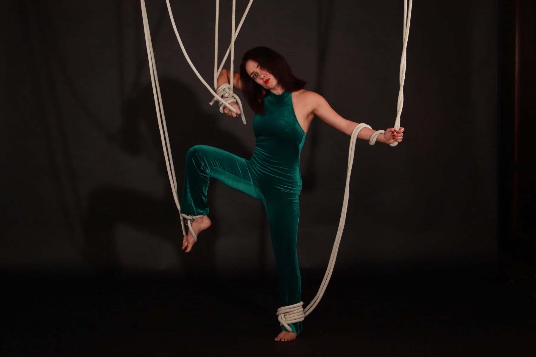 Inspired by the constant battle to get herself out of the web she weaves. Why are we always tied up ? Can she be saved? Is she lost? She is tied up on the railroad track with nobody to save her accept the homeless man spying in the near by tree. This collaboration is a symbol of how blind we are to the minimal effort it can take to untie ourselves from the simple knots we tie if we had knew how to ask for help.